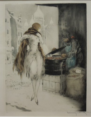 フランスのアール・デコ期の空気を華麗かつ優美に表現した銅版画を多数残した。凍てつくパリの雪景色の街角に立つ焼き栗売りとそこにふっと立ち寄った女性。背景にはサクレ・クール寺院。1928年作。SHIFFER335。