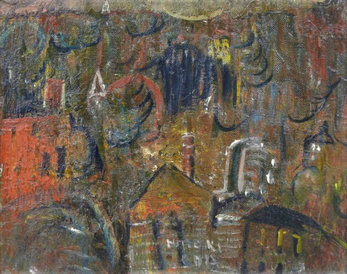 初期の作品に共通するメランコリックな茶褐色が主調のパリ郊外の夜の俯瞰風景。左上にエッフェル塔も見える。