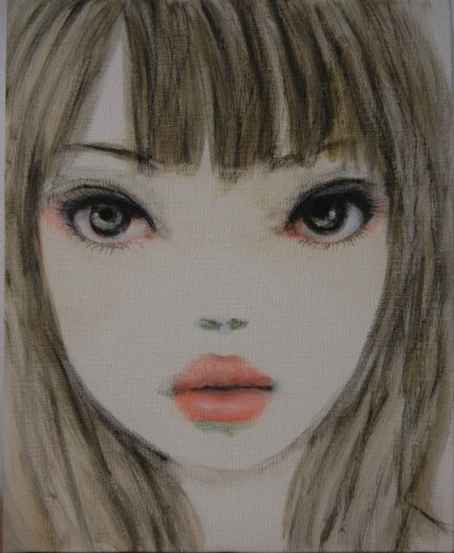 千葉県生まれ。文化学院芸術専門学校(埼玉県、2008年閉校)を2001年に卒業した。卒業前の2000年と2003年に文化フォーラム104柏市美術展で大賞受賞。大きな目が特徴の少女を描いたポップアートのシリーズで知られる。2010年作。カンバス裏にサインと制作年記。