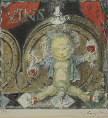 フランスが誇る富についてジャン・コクトーが文を書き、子供になぞらえて藤田が21点のリトグラを制作した挿画本「四十雀」(1963年刊)の中の一点。ワインを飲み過ぎて樽の栓の上に乗ってしまったやんちゃなワイン屋。ピエール・タルタス版。エディション:76/80、レゾネ:B1163.40。
