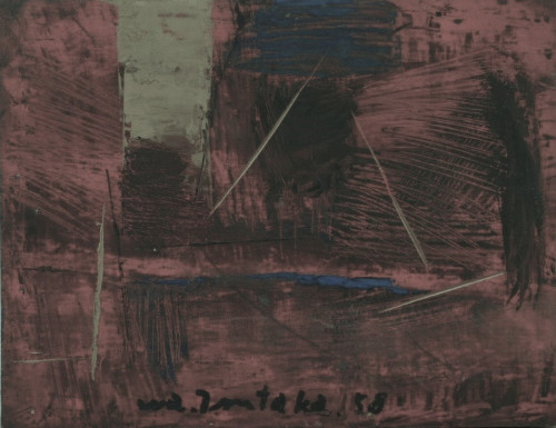 1950年代以降、具象から独自の詩情にあふれた抽象に転じた。西宮市生。16歳で詩を書き始め、戦前は「神戸詩人」に作品を発表。1960年のニューヨーク・グッゲンハイム賞美術展出品など内外で高評価を得た。小品ながら、珍しい抽象初期の1958年作。=売約済み