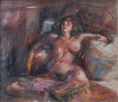 裸婦が身を預けたクッション様のものの赤と右側のついたて様のものの青の対比が美しい。フォーブ風のタッチで作者も時代も分からないが、達者で雰囲気のある作品となっている。
