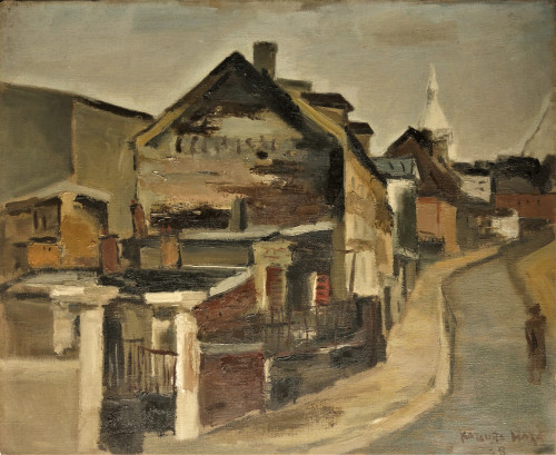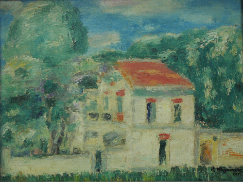 1921(大正10年)~23年外遊後、30~36年にも米国、欧州に滞在した。カンバス裏に制作年(1932年)の年記とともに「巴里郊外」の記載があり、郊外の初夏に似合う瀟洒な赤屋根の白い家を題材としたもの。額は画家の上永井正が製作して贈ったものを使っている。