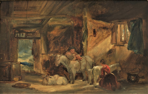19世紀前半に活躍した英国のブリストル派の風景画家。中東やアテネなどにひんぱんに出かけては外国の物珍しい風景をまるで写真で撮ったかのような迫真的な写実力で数多く描き、英国で人気を博した。33歳の若さで没した。早朝の斜光の中、二人の農婦が使役の仔馬の身支度や山羊の乳しぼりに精を出している光景。裏面にTHOS.AGNEW&SONS,LTD(ロンドン)シール。