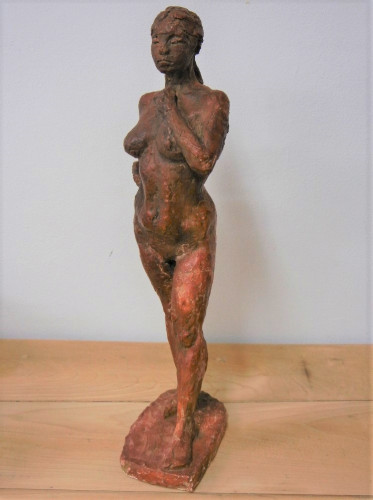 昭和24年、東京芸大を2年で退学し自由美術協会に属して活躍。清新なロマティシズムにあふれた作家と評されたが、52歳で没して惜しまれた。木内岬から影響を受け、画家の古茂田守介、西田勝、小貫政之助らと親しく交友。台座裏に1975年作とある。右腕上腕部に補修跡。右腕肘下部が欠損。