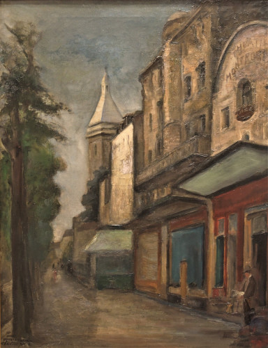 千葉県生。大正9年(1920年)に渡米し、11年仏パリに移る。パリの何気ない街景などを茶かっ色系ほかの渋い色調で情感豊かに数多く描き、高く評価された。サロン・ドートンヌなどに出品し画廊で複数回の個展も開いた。戦争ぼっ発により昭和14年帰国。冬のパリの曇天の街路には冬コート姿の女性が通りかかり、その先にはサクレ・クール寺院の白い尖塔が見える。昭和13年(1938年)作。